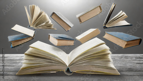 Fototapeta premium A collection of books floating above an open book on a wooden table with soft...