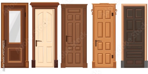 Fototapeta premium A collection of brown wooden interior doors, isolated on a white backdrop,...