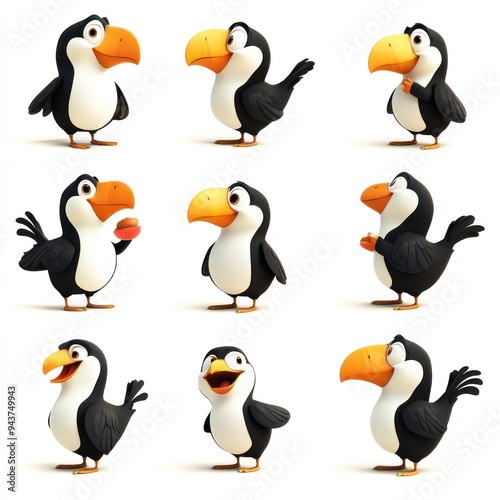 Fototapeta premium A collection of cartoon toucan characters in various poses and expressions.