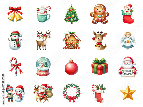 Naklejka premium A collection of christmas-themed watercolor illustrations featuring Santa, reindeer, snowmen, and holiday decorations.