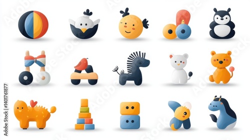 Obraz premium A collection of clean minimalist digital icons depicting a variety of playful educational toys and animal characters in vibrant colors and geometric shapes