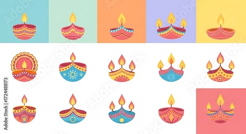 © ArifRus, Naklejka premium A collection of colorful and intricately designed traditional Indian oil lamps (diyas) with burning flames, set against various pastel backgrounds, representing festive decorations.