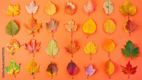 © wiwat apisithpinyo, Fototapeta premium A collection of colorful autumn leaves, against a vibrant orange background.