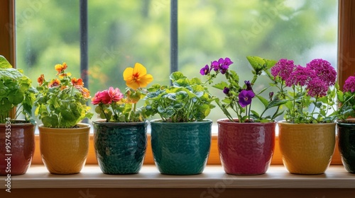 © phattharabodin, Obraz premium A collection of colorful ceramic pots filled with vibrant flowering plants, arranged on a sunny windowsill.