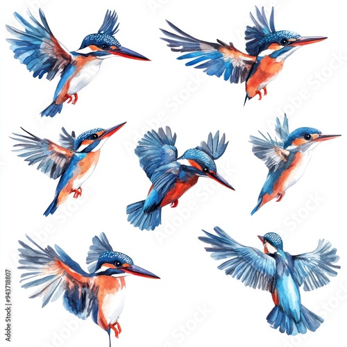 © AURA COLLECTIONS, Naklejka premium A collection of colorful kingfisher illustrations in various flying poses.