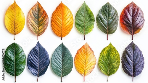 © Fotograf, Obraz premium A collection of colorful leaves arranged on a white background