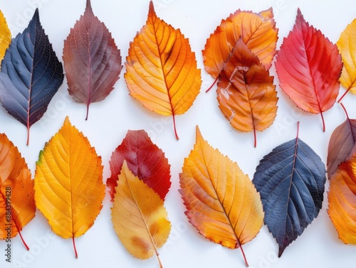 Fototapeta premium A collection of colorful leaves arranged on a white surface