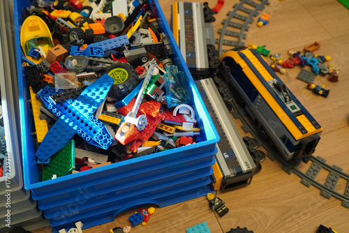 © Everyday Frame, Naklejka premium A collection of colorful Lego bricks and train sets on a wooden surface