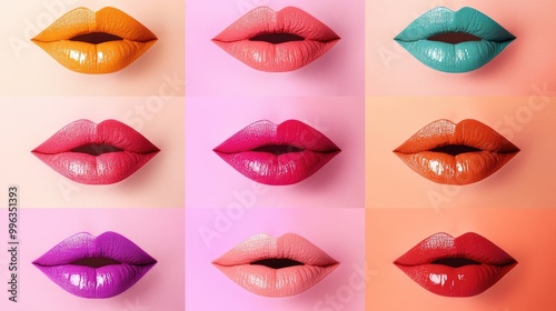 © 69, Obraz premium A collection of colorful lips in various shades on a soft pastel background, creating a fun, fashion-forward image.