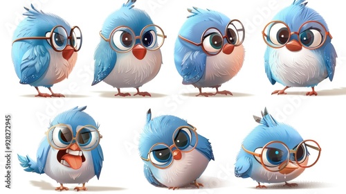 Fototapeta premium A collection of cute blue birds wearing glasses, showcasing various expressions.