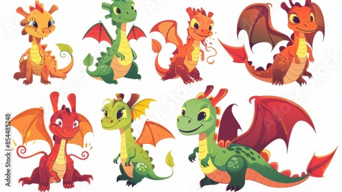 Obraz premium A collection of cute, cartoon dragons in various poses with vibrant colors...