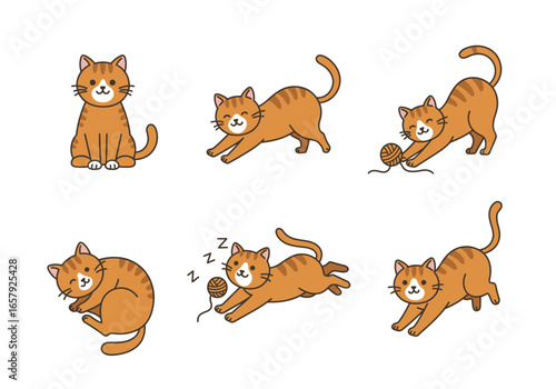 © Zona, Fototapeta premium A collection of cute cartoon ginger tabby cat illustrations in various playful and sleeping poses.