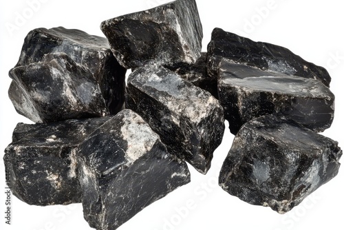 © Barracuda Atelier, Naklejka premium A collection of dark mineral rocks displayed on a clean surface, showcasing natural textures