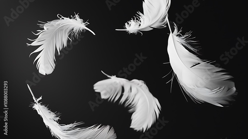 Obraz premium A collection of delicate white feathers gracefully floating against a dark...