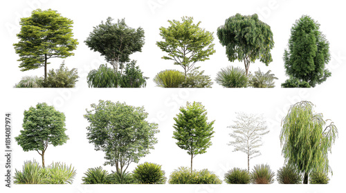 Naklejka premium A collection of diverse trees showcasing various shapes, sizes, and foliage, illustrating the beauty of nature's greenery.