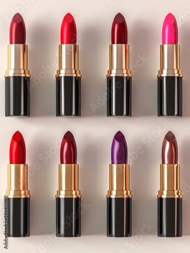 © Oli_Art_Studio, Obraz premium A collection of eight vibrant lipsticks in various shades displayed in a neat arrangement, perfect for beauty and makeup themes.