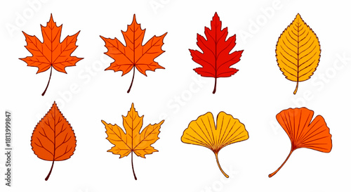 Fototapeta premium A collection of eight vibrantly colored autumn leaves, including maple, oak, and ginkgo varieties, illustrated on a clean white background.