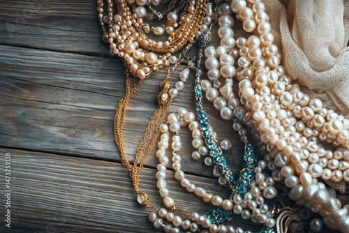 © Rahman, Fototapeta premium A collection of elegant pearl and beaded necklaces on a rustic wooden surface