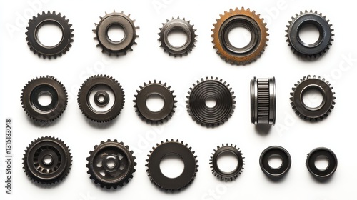 © กาซือมะ สาและ, Obraz premium A collection of engine crankshaft pulleys and timing gears on a white isolated background