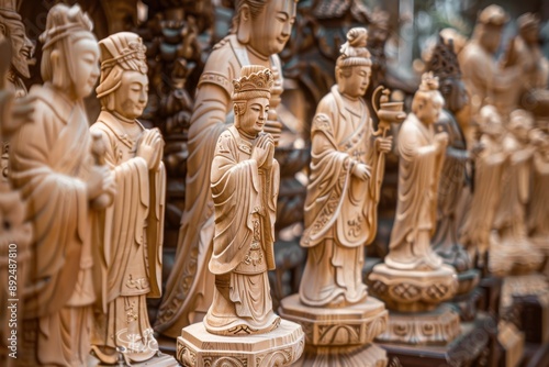 Fototapeta premium A collection of exquisitely carved wooden statues, each with the name of a...