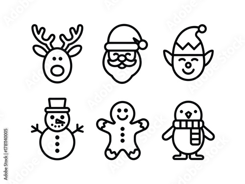 © sofia, Fototapeta premium A collection of festive Christmas icons including a reindeer, Santa Claus, an elf, a snowman, a gingerbread man, and a penguin.