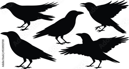 Obraz premium A collection of five black raven silhouettes in various positions