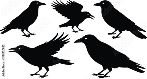© Muhammad Subhan , Obraz premium A collection of five black raven silhouettes on a white background