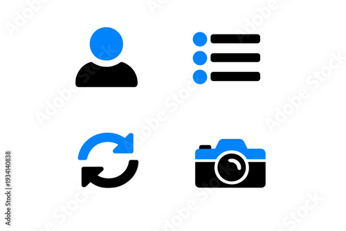 Fototapeta premium A collection of four blue and black digital icons including a user profile, a list menu, a refresh arrow, and a camera, displayed on a solid black background for a modern look.