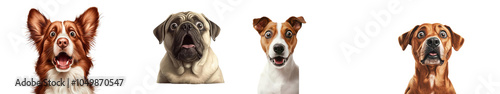 © The PNG God, Obraz premium A collection of four different dog breeds displaying various expressions on a white isolated background.