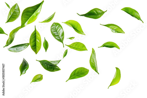 © kageyama, Naklejka premium A collection of fresh green tea leaves gracefully falling against a clean white background. symbolizing natures beauty and purity. ideal for wellness and culinary themes