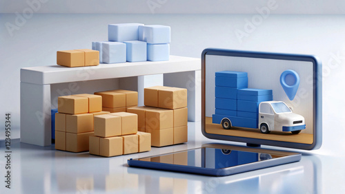 © Czintos Ödön, Obraz premium A collection of geometric boxes in shades of tan and blue are stacked on a white shelf, while a digital tablet displays a 3D rendering of a truck with boxes and a location pin. AI