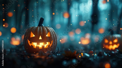 © MAY, Fototapeta premium A collection of glowing jack-o'-lanterns with various facial expressions, set in a dark forest. The pumpkins and jack-o'-lanterns create a haunting Halloween scene.