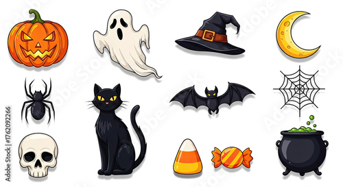 Fototapeta premium A collection of Halloween-themed icons, including pumpkins, ghosts, witch hats, spiders, bats, and candies.