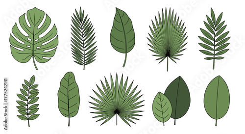 Fototapeta premium A collection of hand-drawn tropical leaf illustrations in shades of green on...