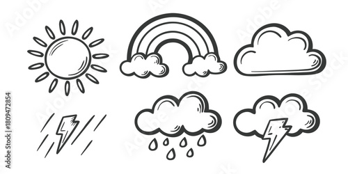 Obraz premium A collection of hand-drawn weather icons including the sun, rainbow, clouds, and lightning.