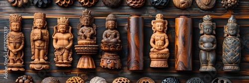 Fototapeta premium A collection of intricately carved wooden Buddha statues and decorative...
