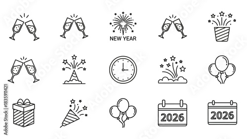 Fototapeta premium A collection of line art icons representing New Year's Eve celebrations and party elements, including fireworks, champagne, and calendars.
