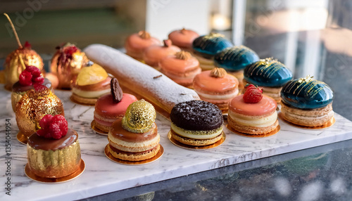 © Konstantin Sigaev, Naklejka premium A collection of luxurious French pastries displayed on a marble counter. Delicate éclairs, colorful macarons, and glossy fruit tarts with gold leaf accents