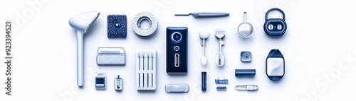 © Siripong, Fototapeta premium A collection of modern digital gadgets and accessories arranged neatly on a light background, showcasing technology and design.