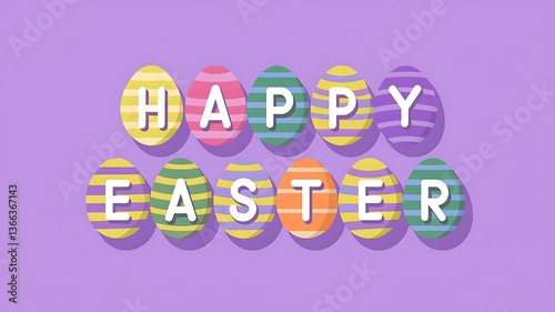 Fototapeta premium A collection of multicolored eggs spelling out the words 'Happy Easter' in vibrant colors with solid purple background and white letters, creating a festive and eye-catching Easter design festive vibe