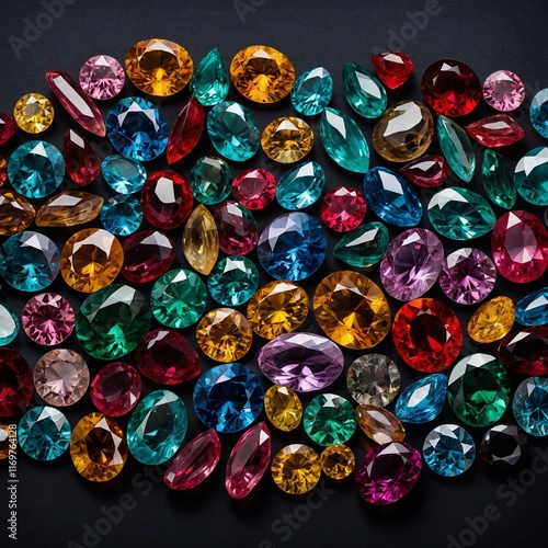© Lodhra, Obraz premium "A collection of multicolored gemstones arranged symmetrically on a dark background."