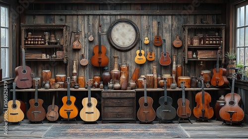 Naklejka premium A collection of musical instruments is displayed against a wooden background, highlighting the beauty and diversity of sound.