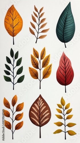 © Thirasak, Obraz premium A collection of nine unique watercolor autumn leaves and branches perfect for fall-themed designs and projects showcasing various shapes colors and textures of foliage.
