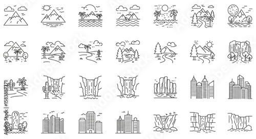Fototapeta premium A collection of outline illustrations depicting various landscapes and...
