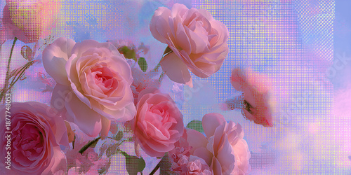 © Alex, Fototapeta premium A collection of pastel roses and lace-like digital patterns creating a soft, sentimental aesthetic.