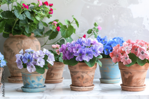Fototapeta premium A collection of potted flowers, with blue, pink, and purple blooms, sit in terracotta pots with decorative details on a white marble countertop
