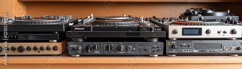 Obraz premium A collection of professional audio equipment including turntables and mixers arranged neatly on a wooden shelf.
