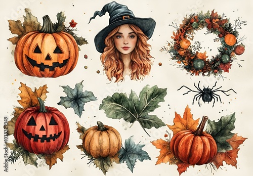Fototapeta premium a collection of pumpkins and leaves