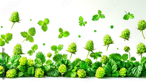 © Kenny Parker, Fototapeta premium A collection of raspberries gently tumbling out of a tipped-over container with green leaves scattered around isolated on white