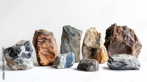 Naklejka premium A collection of rugged rocks, varying in size and form, is displayed on a...